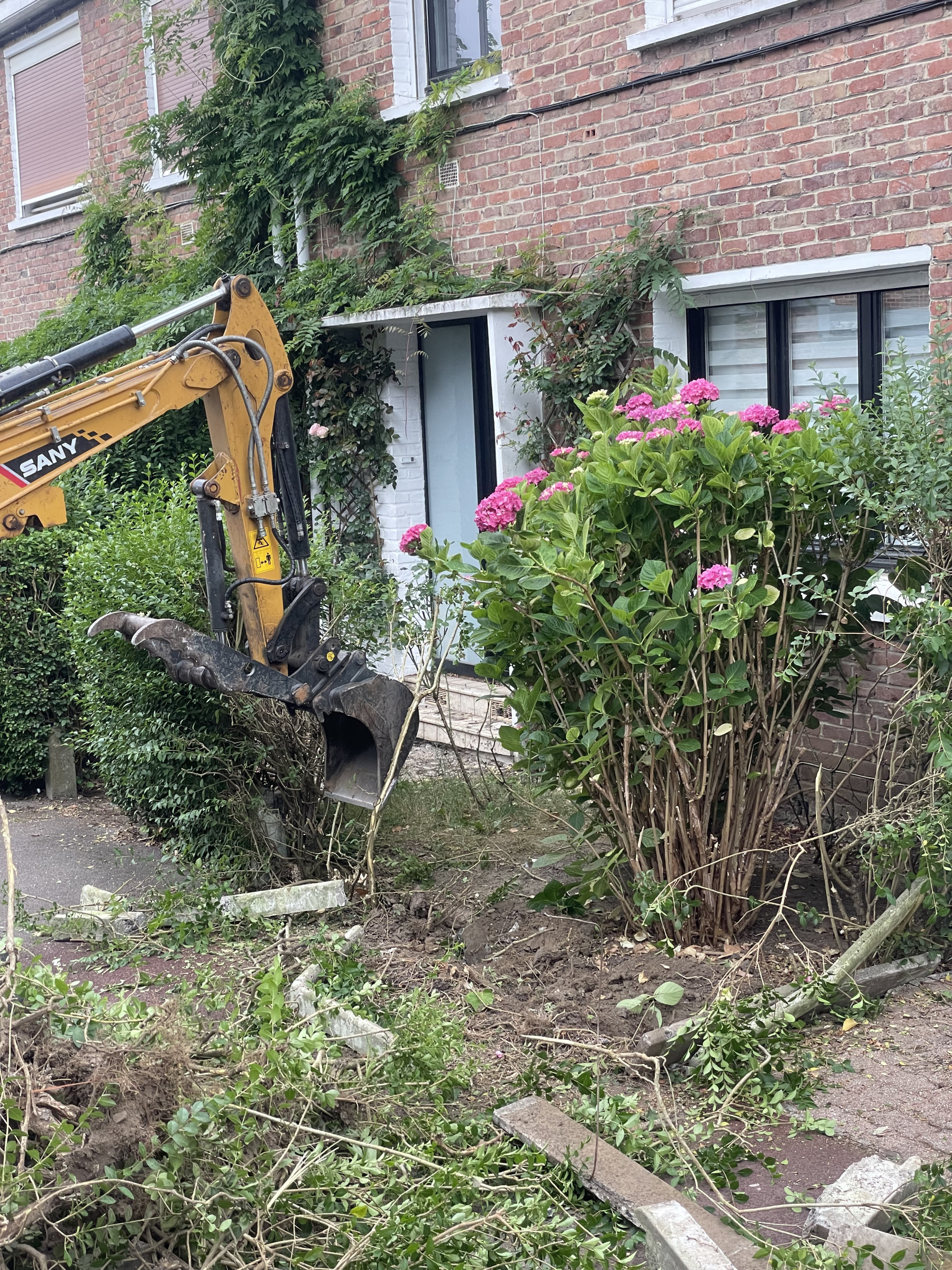 Le chantier a débuté par une phase de préparation du terrain. Les équipes ont procédé à la suppression de l’ancienne haie, au démontage du chemin existant ainsi qu’à l’évacuation des marches et des éléments en place.