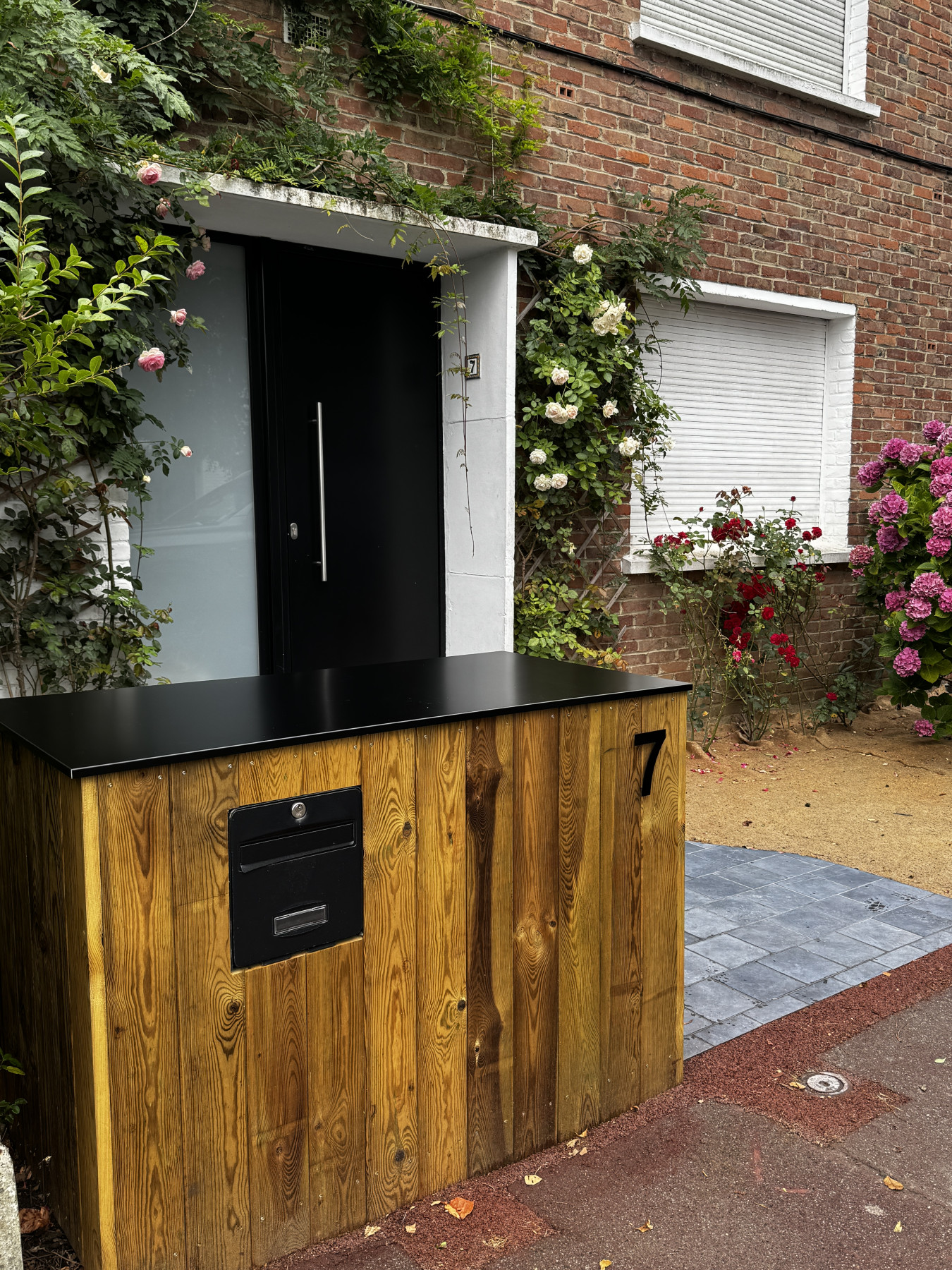 Un habillage en bois sur mesure a été réalisé afin d’intégrer la boîte aux lettres tout en dissimulant la partie technique et électrique.