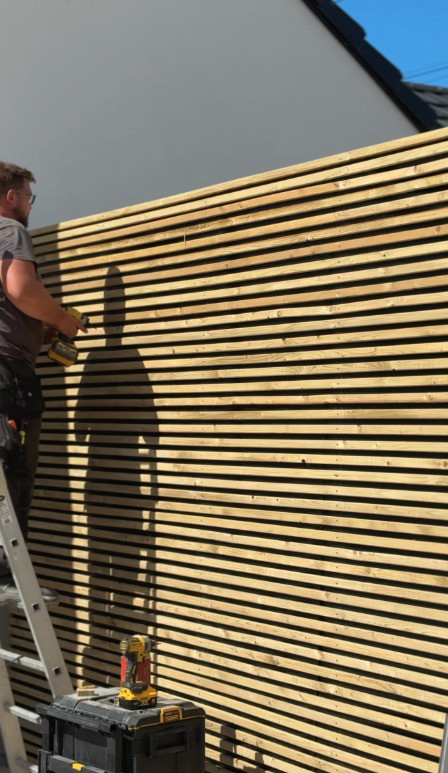 Une clôture en pin sur-mesure a été réalisée pour séparer le parking du jardin. Grâce à ses 2 mètres de hauteur, cette séparation sert de pare-vent et de protection contre les intempéries. Son design unique, chaleureux et accueillant permet de garder l’intimité tout en restant esthétique et intégré dans le jardin.