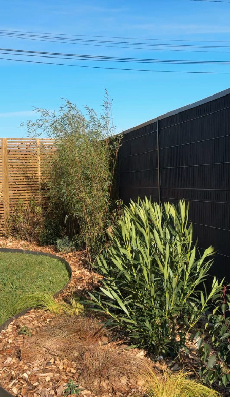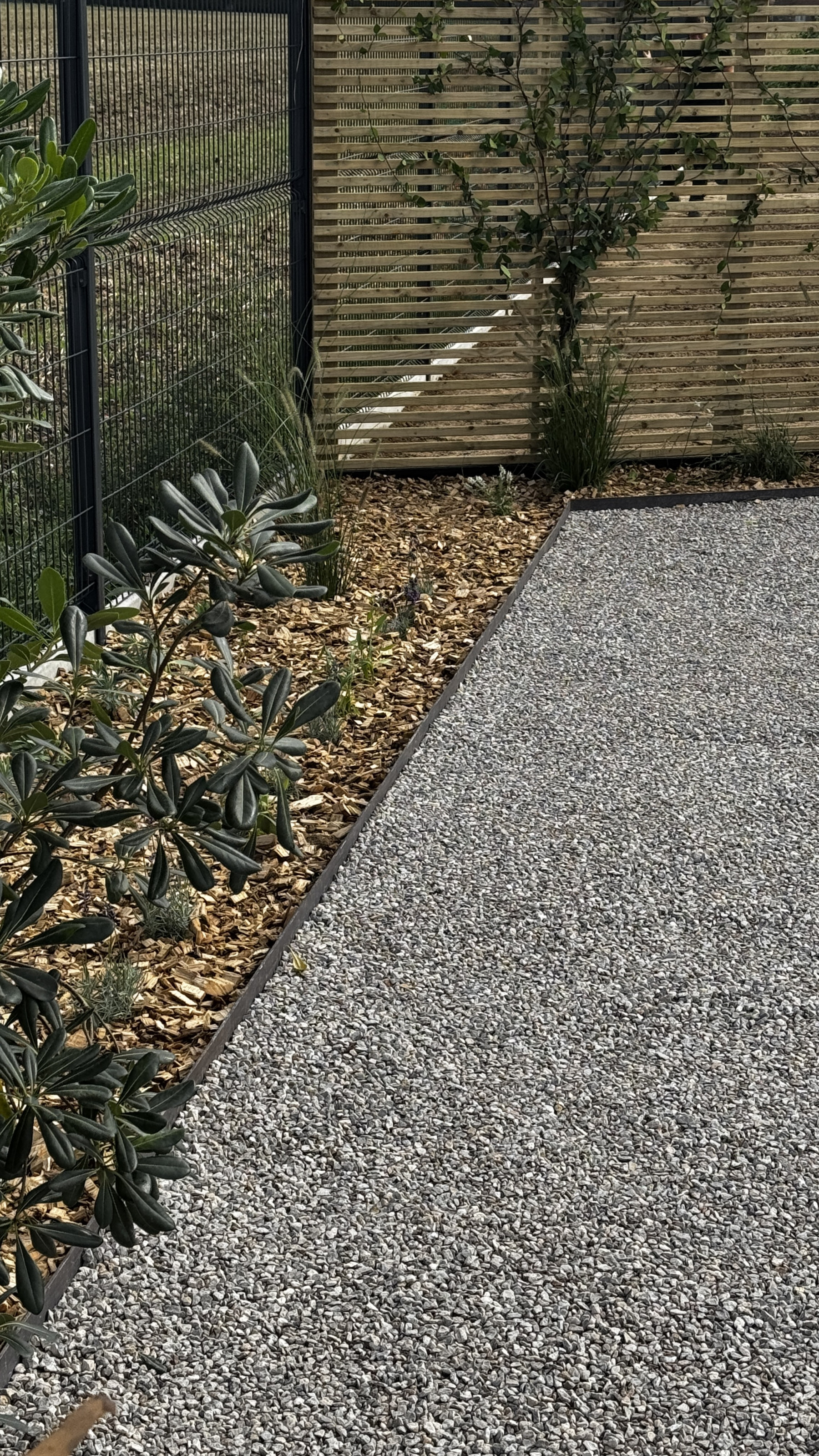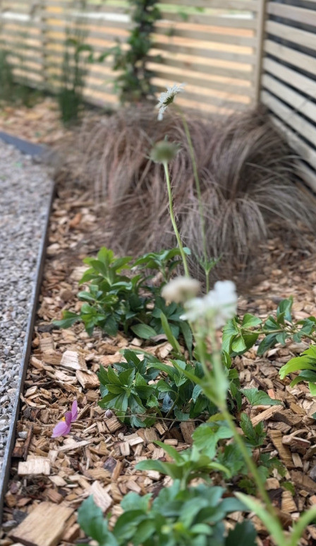 Le sol a été préparé avec de la terre végétale amandée criblée, et un mulch bois dur de 10 cm a été posé pour assurer une durée de vie et un entretien réduit. Une bâche noire avec un gravillon de Marquise a été ajoutée dans le petit jardin côté rue pour compléter l’aménagement et faciliter l’entretien.