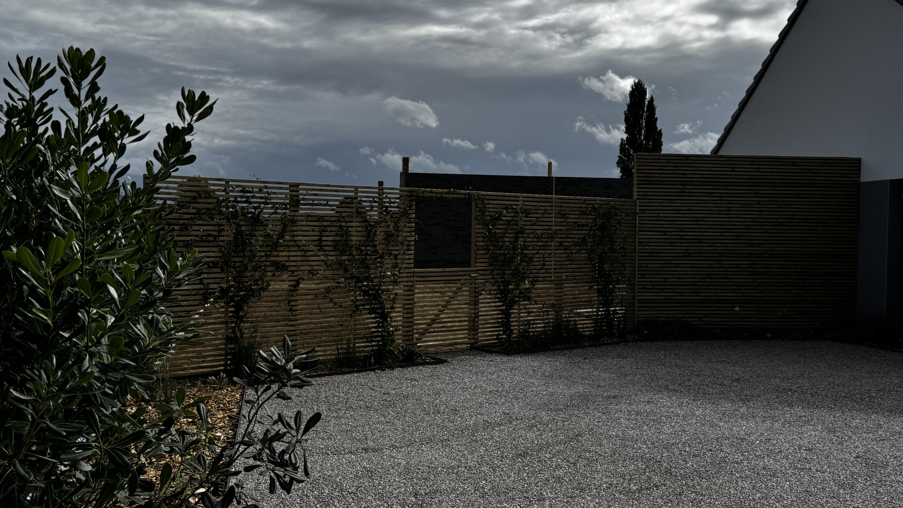 Une allée avec 4 arbres palissés a été créée pour habiller et sécuriser visuellement la zone du jardin, apportant à la fois verticalité et intimité. Les arbres ont été plantés avec tuteurage et supports adaptés pour une croissance optimale.