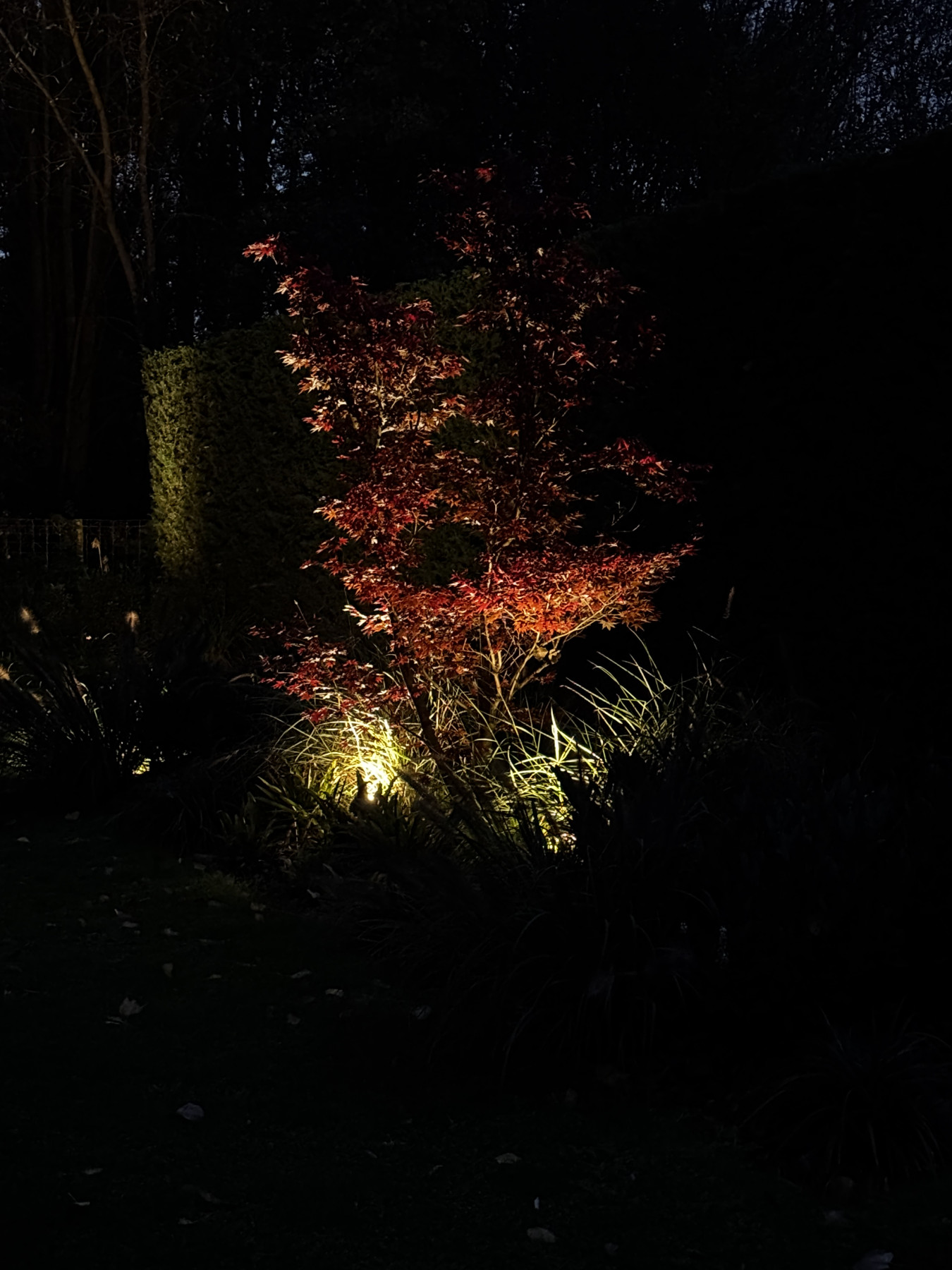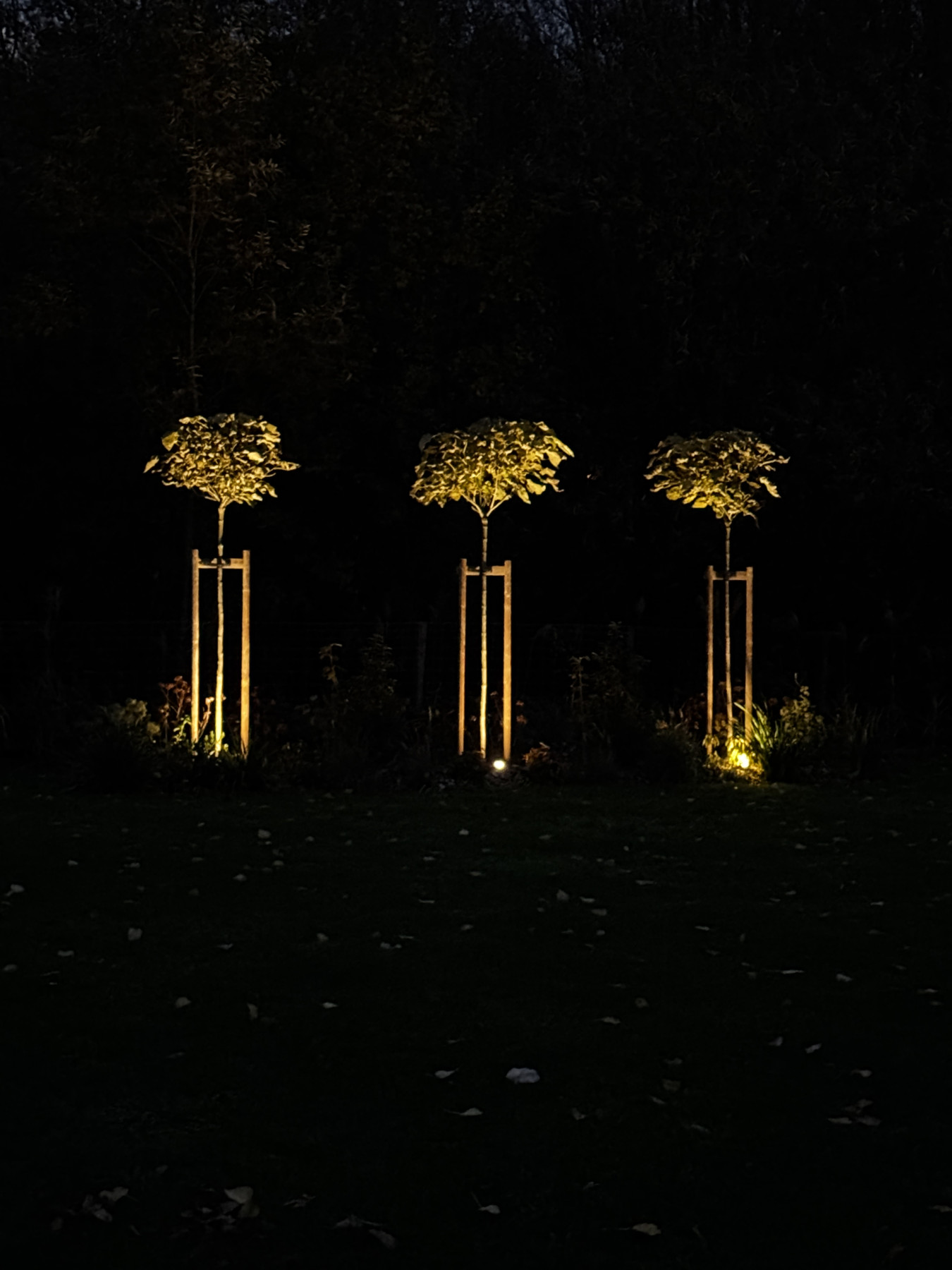 Des spots discrets mettent en valeur les arbres et massifs, tandis qu’un projecteur éclaire le fond du jardin, créant une ambiance chaleureuse et immersive.