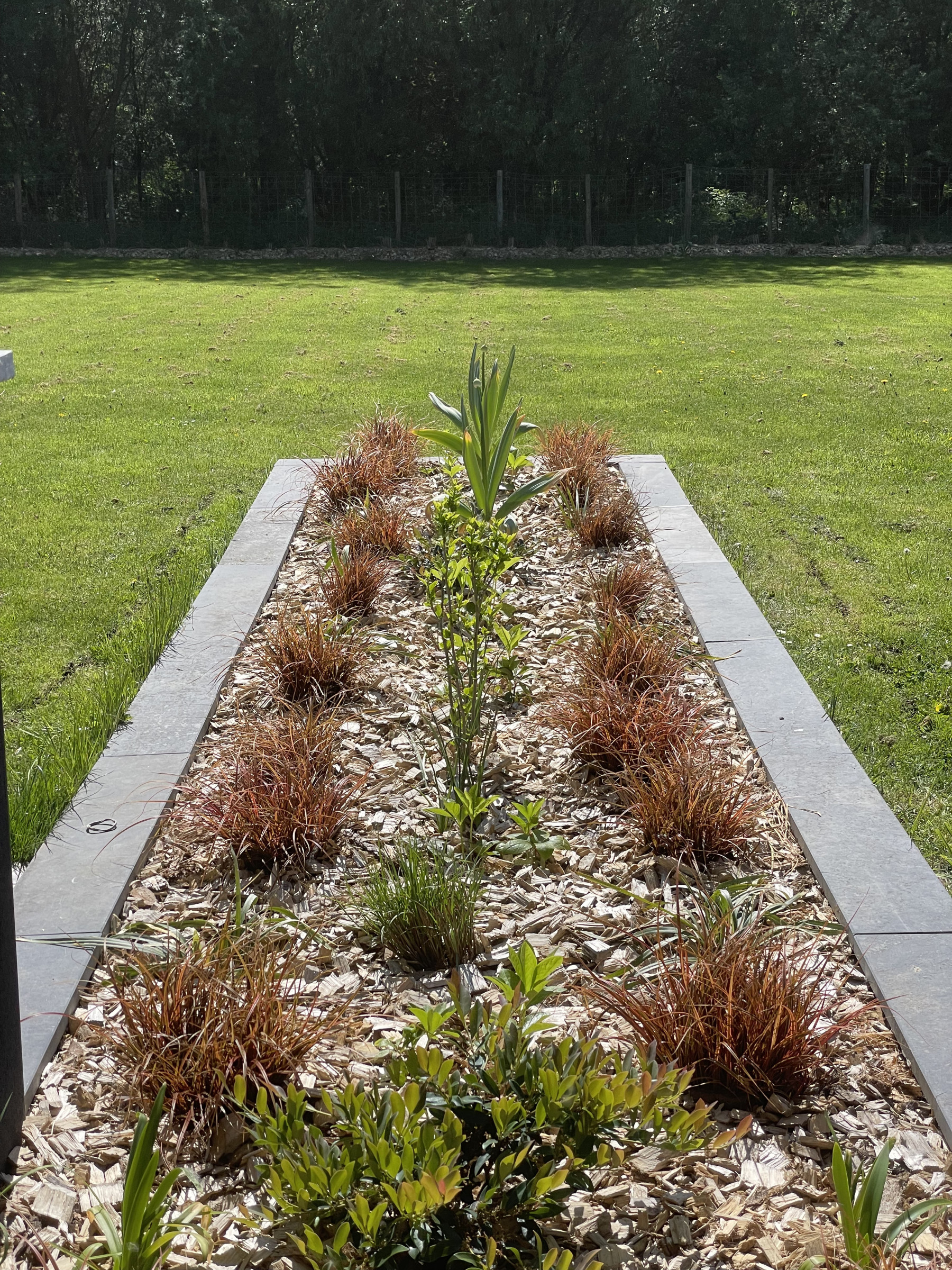 Les massifs ont été végétalisés avec un large choix de graminées et de vivaces, apportant mouvement, légèreté et floraison au fil des saisons.