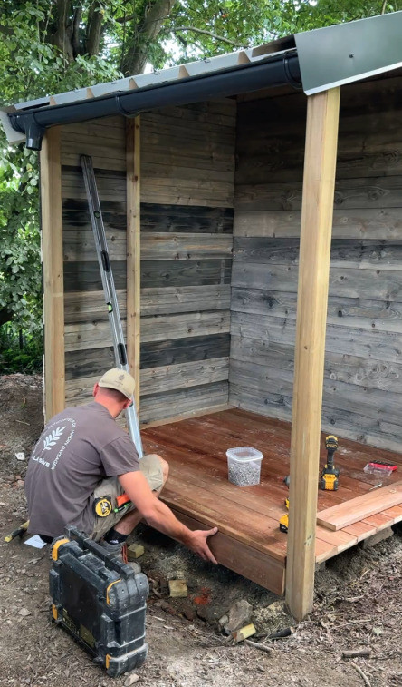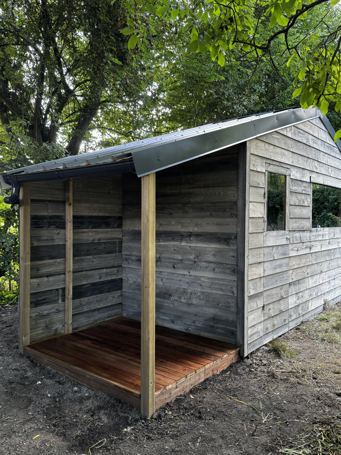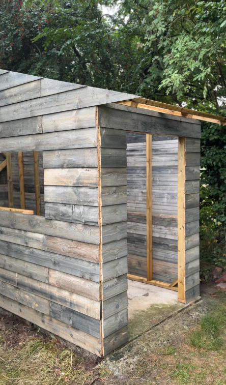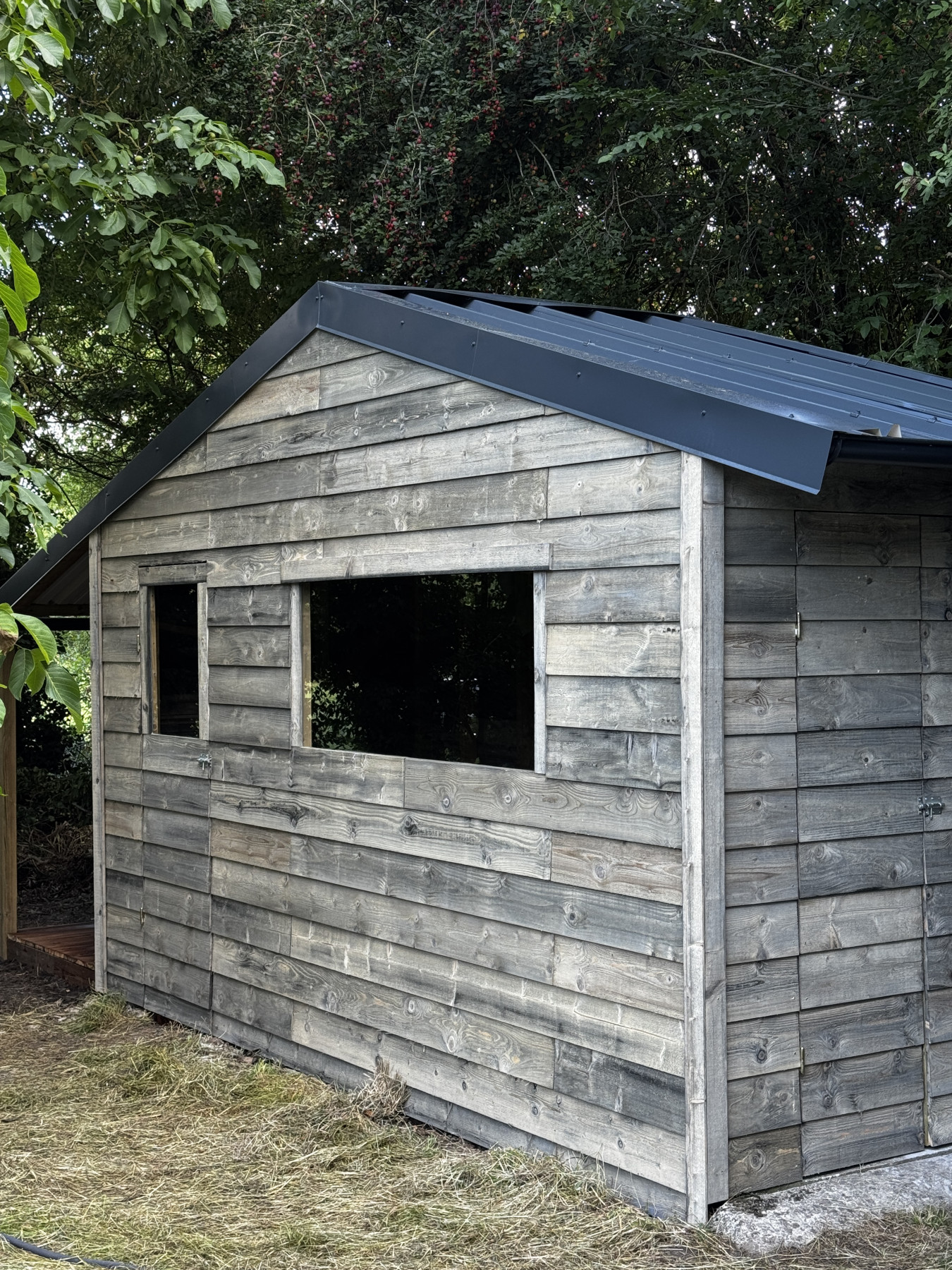 Un nouvel abri de jardin a été réalisé, intégrant une extension bois permettant d’augmenter la surface utile. L’ensemble offre un volume généreux et une hauteur confortable, facilitant le stockage du matériel et l’organisation de l’espace.