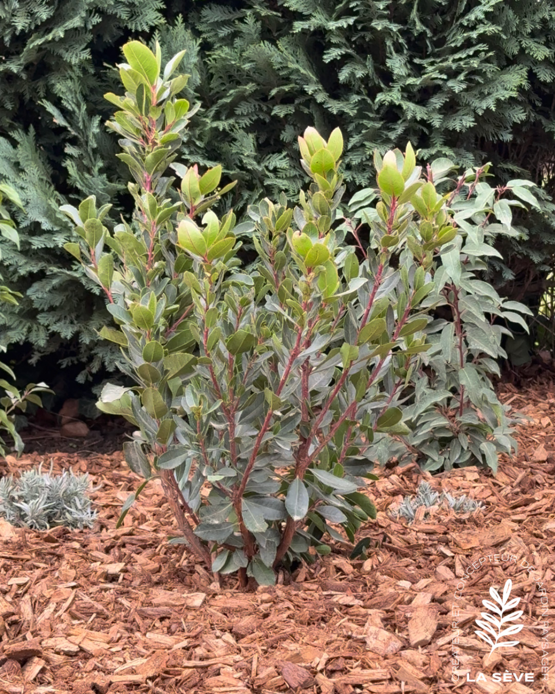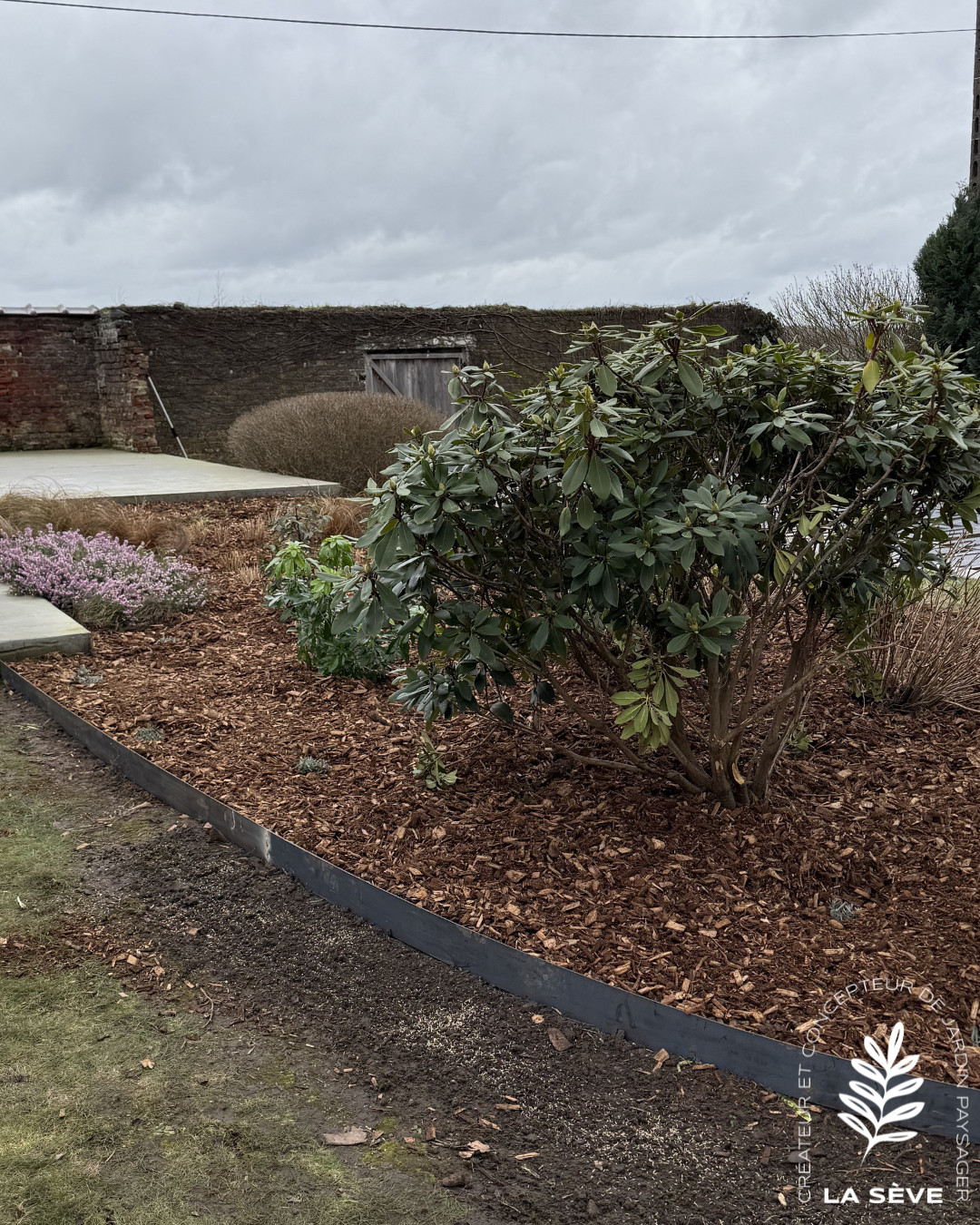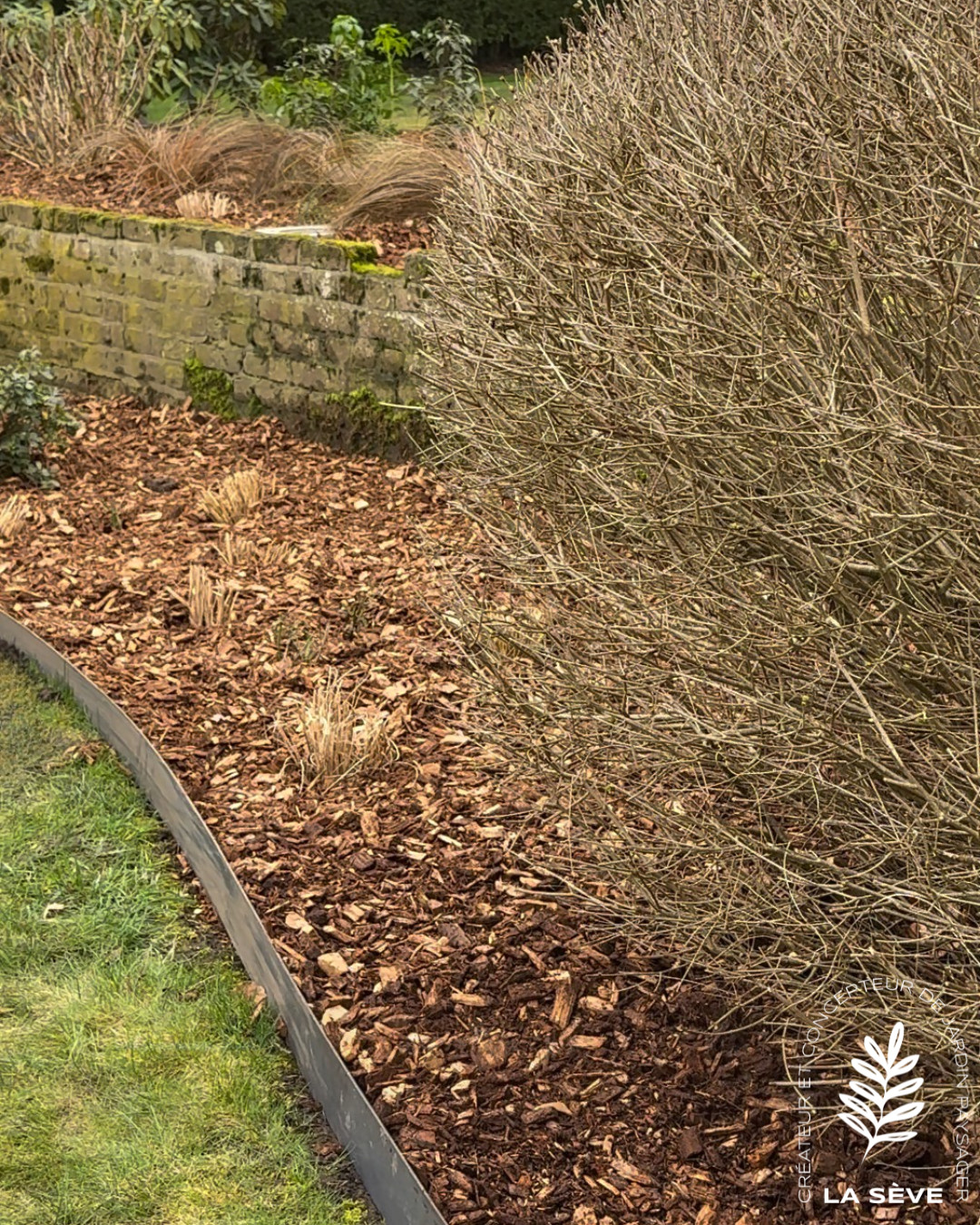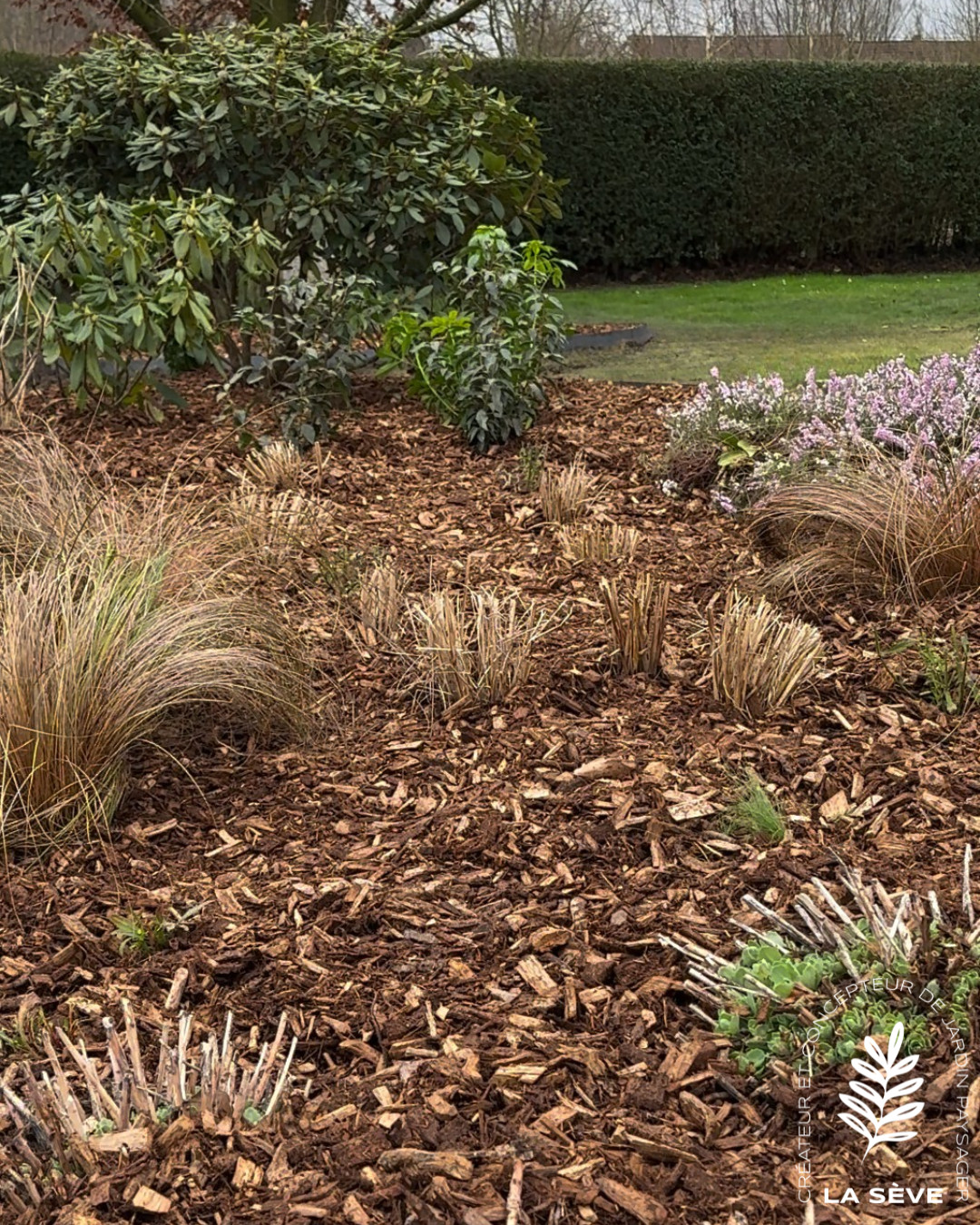 Une finition en mulch bois a été mise en place pour limiter l’entretien et conserver l’humidité du sol.